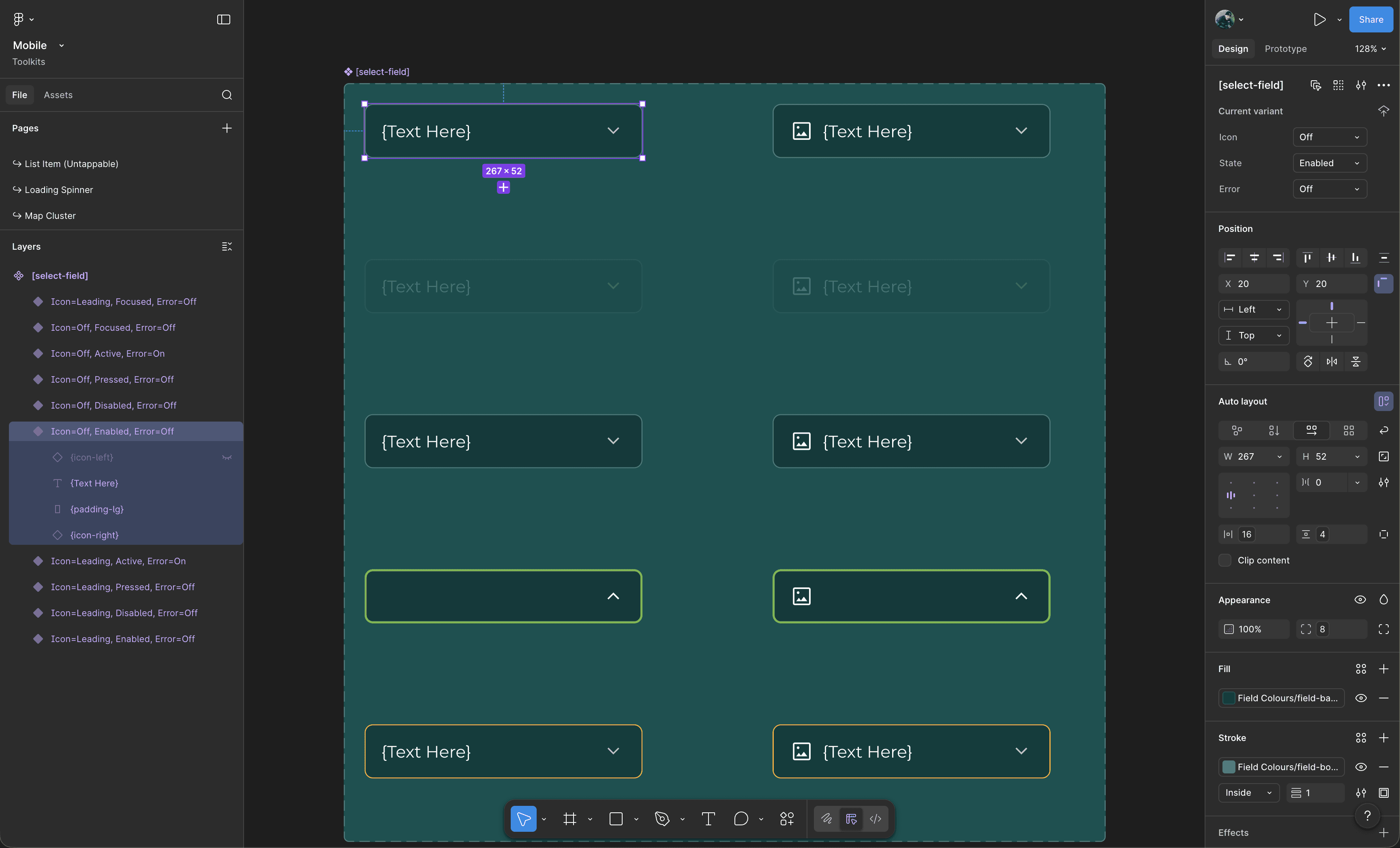 Variant driven select field component supporting consistent states, icons, and error handling across platforms.